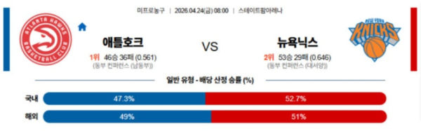 04월24일 애틀랜타 : 뉴욕 NBA 분석 및 예측 스포츠중계,스포츠분석