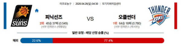 피닉스는 PO 1라운드 2차전이였던 직전경기 (4/23) 원정에서 오클라호마 상대로 107-120 패배를 기록했으며 PO 1라운드 1차전 (4/20) 원정에서 오클라호마 상대로 84-119 패배를 기록했다. 2연패 흐름 속에 리바운드 44-40, 3점슛 11-14, 턴오버 21-10의 결과. 딜런 브룩스(30득점)가 외곽과 돌파에서 활약했지만 4쿼터 파울아웃으로 이탈하며 흐름이 끊겼고 데빈 부커(22득점), 제일런 그린(21득점)이 지원했지만 경기 전체 흐름을 뒤집기에는 부족했던 경기. 전반까지는 65-57로 따라붙으며 경쟁력을 보였지만 3쿼 터에서 상대에게 대량 실점을 허용하며 격차가 벌어졌고 이후 추격 과정에서도 수비에서 상대 공격을 제어하지 못한 점이 패배로 이 어졌던 상황. 경기 막판 부커가 연속 득점으로 격차를 좁혔지만 이미 벌어진 점수를 뒤집기에는 시간이 부족했던 상황이며 전체적으 로 수비 집중력과 턴오버 관리에서 문제를 드러낸 경기였다. 홈경기에서는 26승17패를 기록했다.