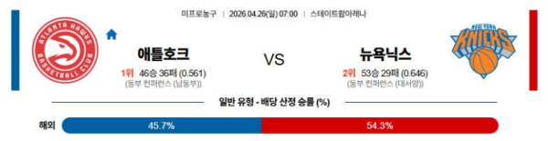 애틀란타는 PO 1라운드 3차전이였던 직전경기 (4/24) 홈에서 뉴욕 상대로 109-108 승리를 기록했으며 PO 1라운드 2차전 원정에 서 뉴욕 상대로 107-106 승리를 기록했다. 2연승 흐름 속에 리바운드 45-47, 3점슛 13-10, 턴오버 15-13의 결과. 한때 18점차까 지 앞섰던 경기에서 격차가 줄어들었고 경기 막판에는 역전을 허용하는 위기도 있었지만 마지막 집중력에서 차이를 만들어냈던 경 기. C.J. 맥컬럼 (23득점)이 종료 12.5초 전 결승 점퍼를 성공시키며 승부를 결정지었고 제일런 존슨(24득점)이 팀 내 최다 득점으로 공격을 이끌었던 상황. 또한, 벤치에서는 조너선 쿠밍가(21득점)이 활약하며 공격 옵션을 넓혀줬고 전체적으로 고른 득점 분포와 클 러치 상황 집중력이 승리 요인이 된 경기였다. 홈경기에서는 25승17패 성적.