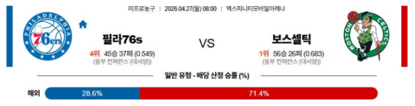 04월27일 필라델피아 : 보스턴 NBA 분석 및 예측 스포츠중계,스포츠분석