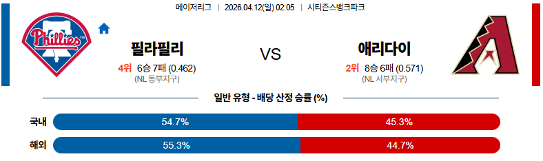 04월12일 필라델피아:애리조나 MLB 분석 및 예측 스포츠중계:스포츠무료중계
