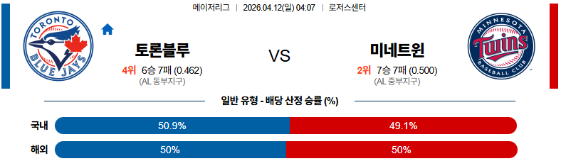 04월12일 토론토:미네소타 MLB 분석 및 예측 스포츠중계:스포츠무료중계