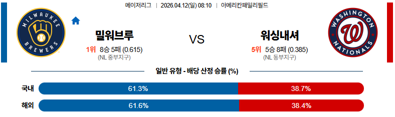04월12일 밀워키:워싱턴 MLB 분석 및 예측 스포츠중계:스포츠무료중계