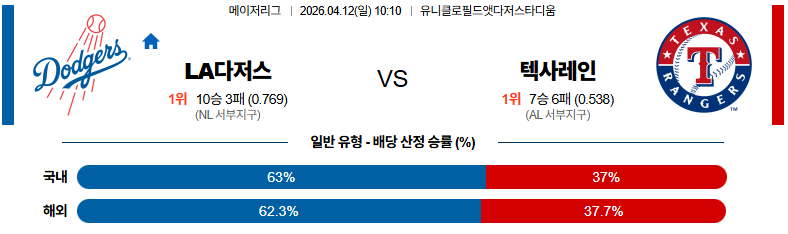 04월12일 LA다저스:텍사스 MLB 분석 및 예측 스포츠중계:스포츠무료중계