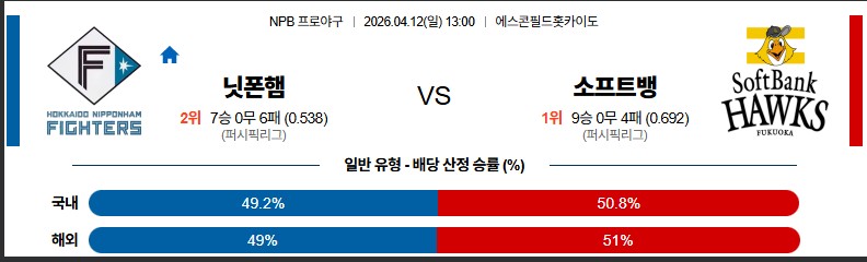 04월12일 니혼햄:소프트뱅크 NPB 분석 및 예측 스포츠중계:스포츠무료중계