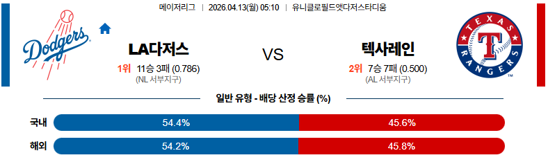 04월13일 LA다저스:텍사스 MLB 분석 및 예측 스포츠중계:스포츠무료중계