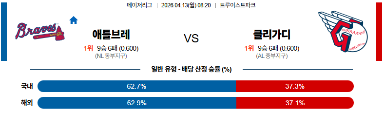 04월13일 애틀랜타:클리블랜드 MLB 분석 및 예측 스포츠중계:스포츠무료중계