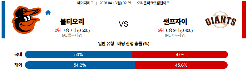 04월13일 볼티모어:샌프란시스코 MLB 분석 및 예측 스포츠중계:스포츠무료중계