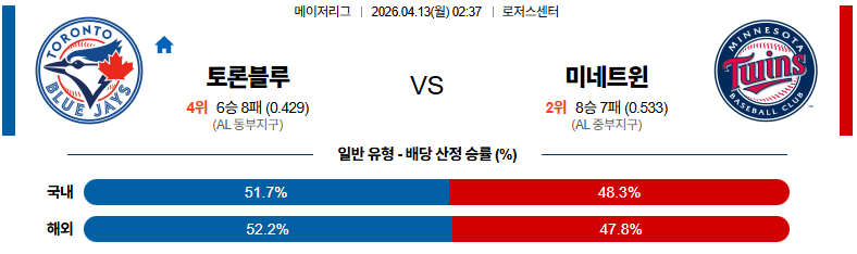 04월13일 토론토:미네소타 MLB 분석 및 예측 스포츠중계:스포츠무료중계