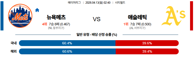 04월13일 뉴욕메츠:애슬레틱스 MLB 분석 및 예측 스포츠중계:스포츠무료중계