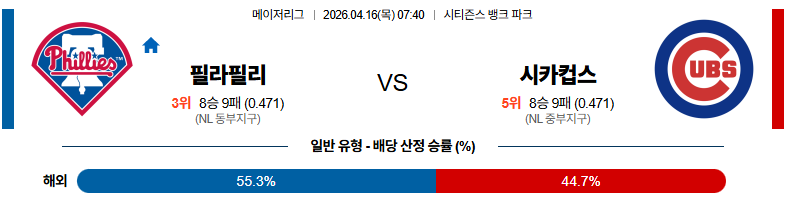 04월16일 필라델피아 : 시카고컵스 MLB 맞대결 생중계, 스포츠중계, 스포츠분석