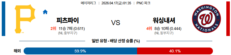 04월17일 피츠버그 : 워싱턴 MLB 분석 및 예측 스포츠중계,스포츠분석