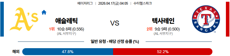 04월17일 애슬레틱스 : 텍사스 MLB 분석 및 예측 스포츠중계,스포츠분석