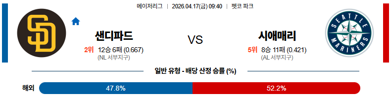 04월17일 샌디에이고 : 시애틀 MLB 분석 및 예측 스포츠중계,스포츠분석
