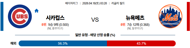 04월18일 시카고컵스 : 뉴욕메츠 MLB 분석 및 예측 스포츠중계,스포츠분석