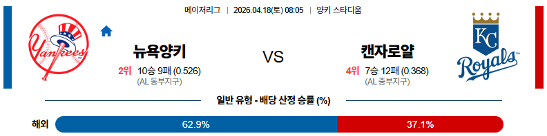 04월18일 뉴욕양키스 : 캔자스시티 MLB 분석 및 예측 스포츠중계,스포츠분석