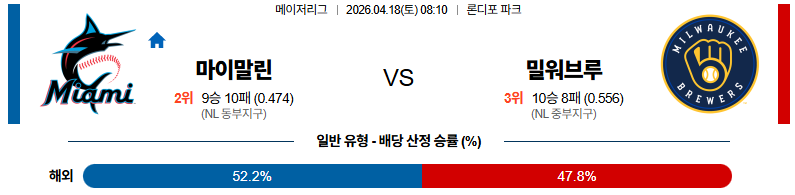 04월18일 마이애미 : 밀워키 MLB 분석 및 예측 스포츠중계,스포츠분석