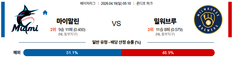 04월19일 마이애미:밀워키 MLB 분석 및 예측 스포츠중계:스포츠무료중계