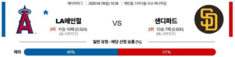 04월19일 LA에인절스:샌디에이고 MLB 분석 및 예측 스포츠중계:스포츠무료중계