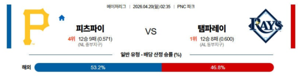 04월20일 피츠버그 : 탬파베이 MLB 분석 및 예측 스포츠중계,스포츠분석
