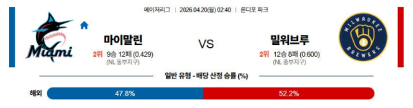 04월20일 마이애미 : 밀워키 MLB 분석 및 예측 스포츠중계,스포츠분석