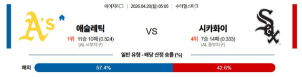 04월20일 애슬레틱스 : 시카고화이트삭스 MLB 분석 및 예측 스포츠중계,스포츠분석