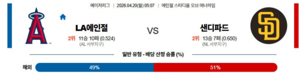 04월20일 LA에인절스 : 샌디에이고 MLB 분석 및 예측 스포츠중계,스포츠분석