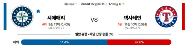 04월20일 시애틀 : 텍사스 MLB 분석 및 예측 스포츠중계,스포츠분석