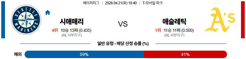 04월21일 시애틀 : 애슬레틱스 MLB 분석 및 예측 스포츠중계,스포츠분석