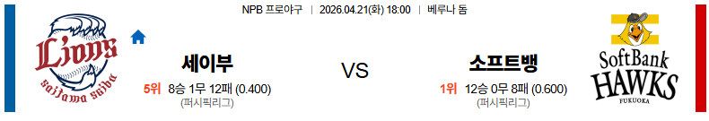 04월21일 세이부 : 소프트뱅크 NPB 분석 및 예측 스포츠중계,스포츠분석