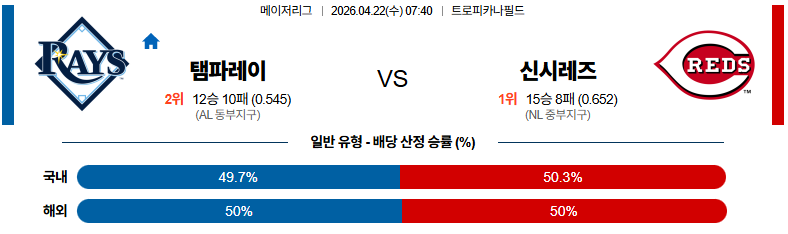 04월22일 탬파베이 : 신시내티 MLB 분석 및 예측 스포츠중계,스포츠분석