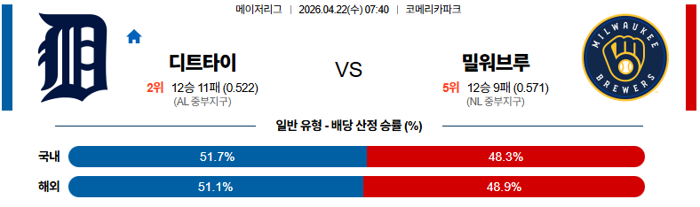 04월22일 디트로이트 : 밀워키 MLB 분석 및 예측 스포츠중계,스포츠분석