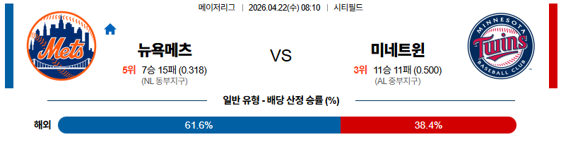 04월22일 뉴욕메츠 : 미네소타 MLB 분석 및 예측 스포츠중계,스포츠분석