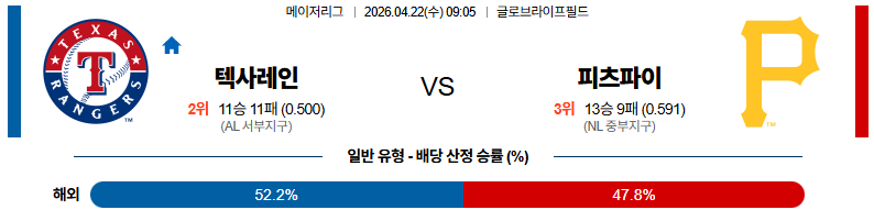 04월22일 텍사스 : 피츠버그 MLB 분석 및 예측 스포츠중계,스포츠분석