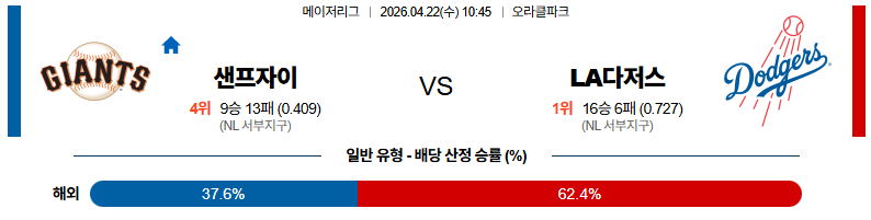 04월22일 샌프란시스코 : LA다저스 MLB 분석 및 예측 스포츠중계,스포츠분석