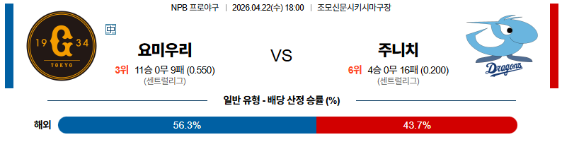 04월22일 요미우리:주니치 NPB 분석 및 예측 스포츠중계:스포츠무료중계