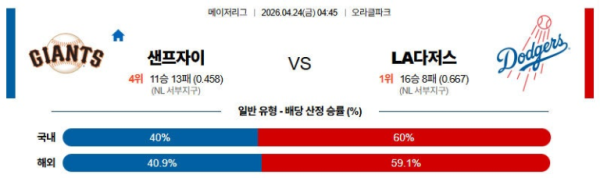 04월24일 샌프란시스코 : LA다저스 MLB 분석 및 예측 스포츠중계,스포츠분석