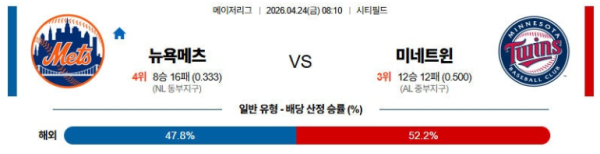 04월24일 뉴욕메츠 : 미네소타 MLB 분석 및 예측 스포츠중계,스포츠분석