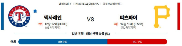 04월24일 텍사스 : 피츠버그 MLB 분석 및 예측 스포츠중계,스포츠분석