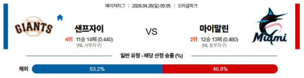 04월26일 샌프란시스코 : 마이애미 MLB 분석 및 예측 스포츠중계,스포츠분석