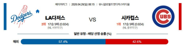 04월26일 LA다저스 : 시카고C MLB 분석 및 예측 스포츠중계,스포츠분석