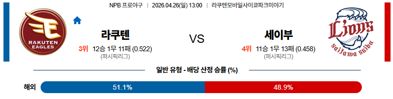 04월26일 라쿠텐:세이부 NPB 분석 및 예측 스포츠중계:스포츠무료중계