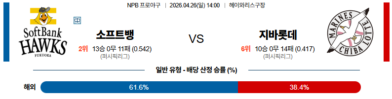 04월26일 소프트뱅크:지바롯데 NPB 분석 및 예측 스포츠중계:스포츠무료중계