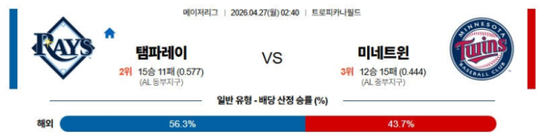 04월27일 탬파베이 : 미네소타 MLB 분석 및 예측 스포츠중계,스포츠분석