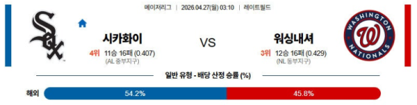 04월27일 시카고W : 워싱턴 MLB 분석 및 예측 스포츠중계,스포츠분석