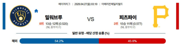 04월27일 밀워키 : 피츠버그 MLB 분석 및 예측 스포츠중계,스포츠분석