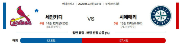04월27일 세인트루이스 : 시애틀 MLB 분석 및 예측 스포츠중계,스포츠분석
