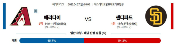 04월27일 애리조나 : 샌디에이고 MLB 분석 및 예측 스포츠중계,스포츠분석