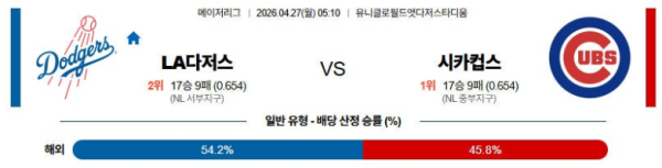 04월27일 LA다저스 : 시카고C MLB 분석 및 예측 스포츠중계,스포츠분석