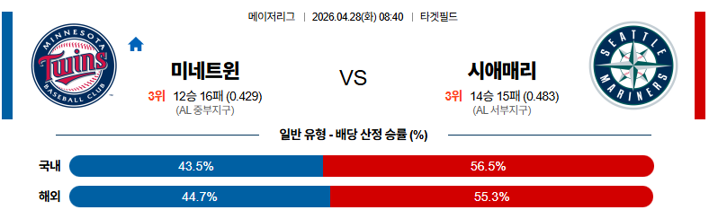 04월28일 미네소타 : 시애틀 MLB 분석 및 예측 스포츠중계,스포츠분석